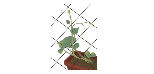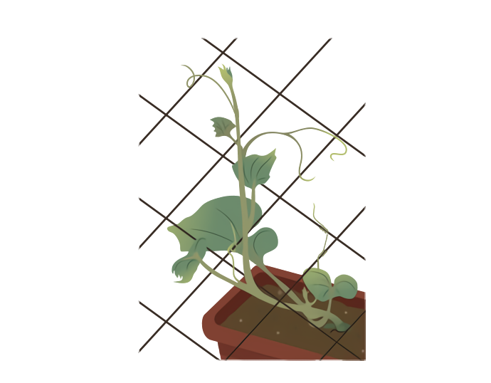 誘引の際はネットの内側から行うと、葉などを気にせず作業することができます。また、ネットの手前に置いた鉢から、つるが伸びてネットに届いたら、ネットの外側へつるを出して誘引します。