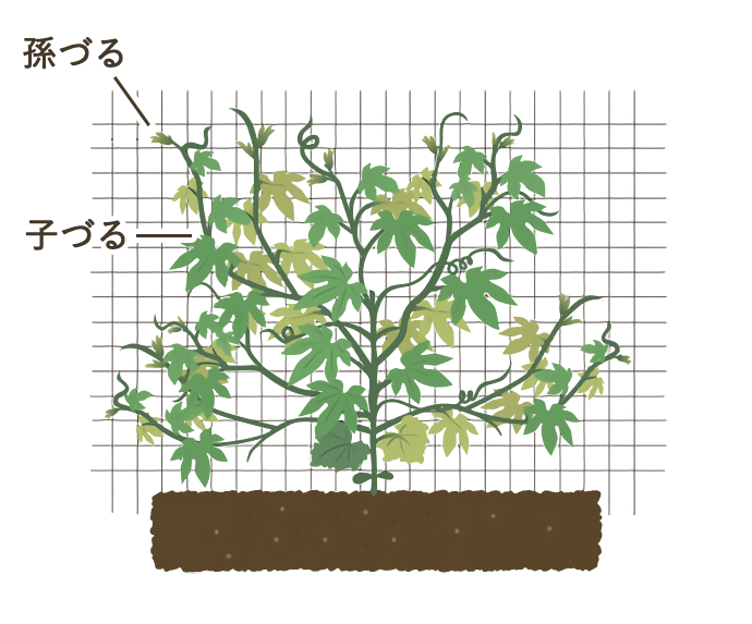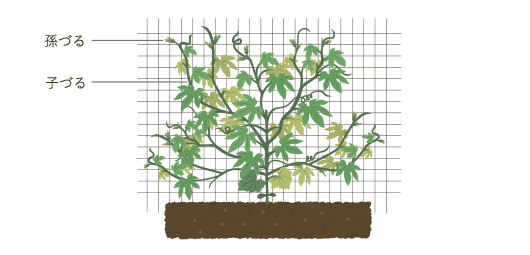 そこで、本葉が数枚のときに、成長の盛んな親づるの先端を摘み取る作業をします。これを摘芯(てきしん)といいます。摘芯をすることで、わき芽が伸び子づるになり、さらに子づるのわき芽も伸びて孫づるになり、葉に覆われたカーテンとなります。