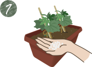 元肥配合済みの用土か、自分で配合し元肥を施した場合のいずれも、おおむね1カ月で肥料の効果が切れてきます。緑のカーテンは長く栽培するので、追肥で後から養分を補う必要があります。また、緑のカーテンでは葉を茂らせることが主な目的になりますので、通常より早く多めの肥料を施せば、花や果実の付きを抑え、葉を茂らせることができます。定植から1カ月たったら、週に1回のペースで、追肥として化成肥料を継続して施すことが大切です。