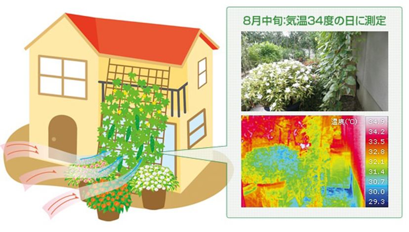 打ち水効果の高いサンパチェンスを「緑のカーテン」の近くで育てることにより、冷却効果がさらに上がり、快適度がアップします。打ち水効果とは、植物が根から水分を吸収し、葉から蒸散することで、自分自身の温度を下げることです。また、葉の陰になっている空間の気温は、葉の表面温度よりもさらに低くなることから、そこで冷やされた空気が風や対流で拡散し、植物周辺の温度は気温よりさらに低下します。暑い夏、旺盛に水分を吸収しながら成長するサンパチェンスは、特に打ち水効果が高く、裸地に打ち水するよりも温度低下の効率がよいことが実証されています。