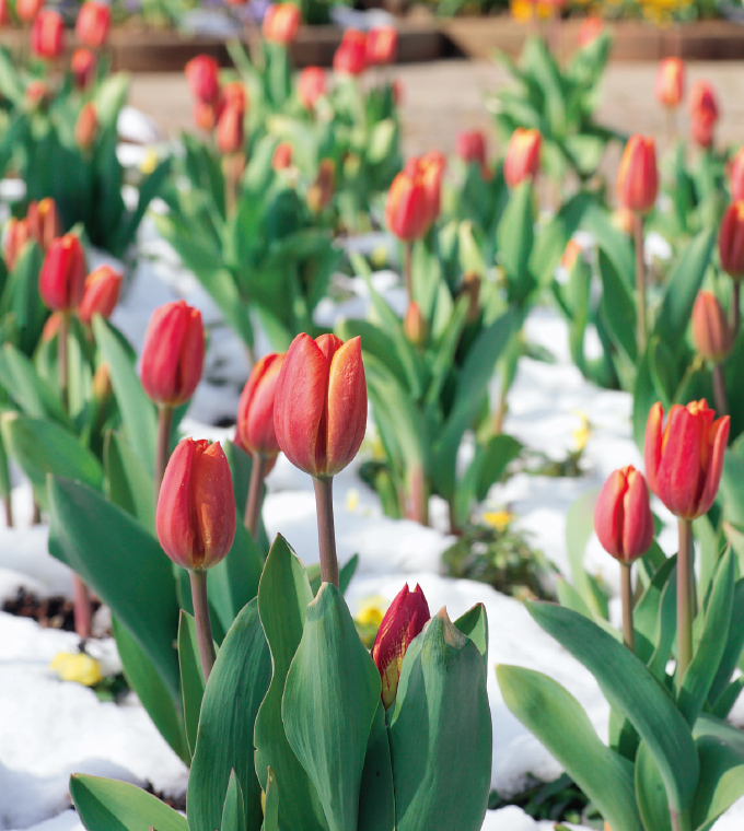 春咲きチューリップの1~2週間の開花に対して、アイスチューリップは低温時期に開花するため、1カ月以上咲き続けます。