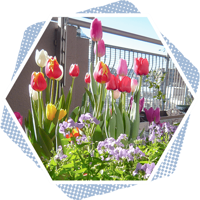 冬場は午前中は日があたらないバルコニーでも立派に育ちました。窓からバルコニーを眺めると春いっぱいのような気がして気分が明るくなります。本当にきれいないろいろな種類のチューリップで感動しました。