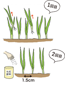 定植後25日くらいと苗が伸びだす早春(関東で3月上旬)の2回、追肥をします。マルチを使用している場合は植え穴にまきます。