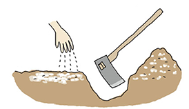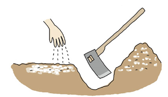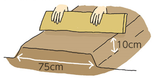 1平方メートル当たり苦土石灰を3握り(約150g)、化成肥料を2握り(約100g)入れて深く耕し、畝をつくって板などで平らにします。