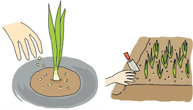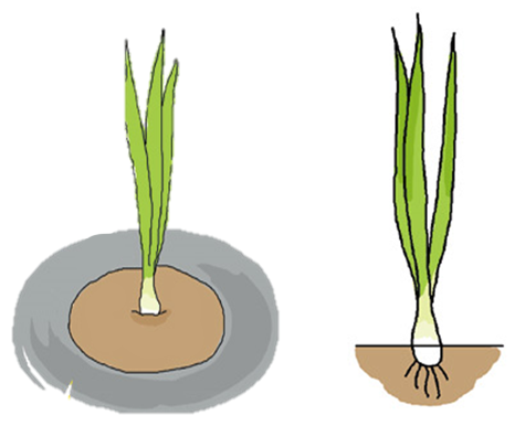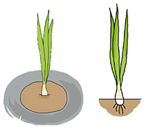 茎の白い部分が見えるように植え付けます。
