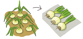 収穫適期は全体の約8割の茎が倒伏したら、天気のよい日を見計らい全部収穫したら、雨の当たらない場所に並べて1~3日乾かします。