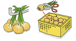 葉付きのまま数株ずつ束ねて風通しのよい場所につるすか、茎を切って網袋か箱に入れて風通しのよい場所に置いて貯蔵します。
