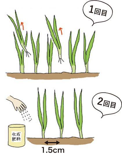 2回目は、草丈約10cmで1.5cm間隔に間引き終わったら、1平方メートル当たり化成肥料を軽く1握り(約30g)を追肥します。育苗日数は50~60日程度です。