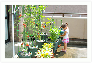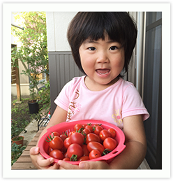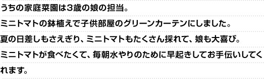 うちの家庭菜園は3歳の娘の担当。ミニトマトの鉢植えで子供部屋のグリーンカーテンにしました。夏の日差しもさえぎり、ミニトマトもたくさん採れて、娘も大喜び。ミニトマトが食べたくて、毎朝水やりのために早起きしてお手伝いしてくれます。
