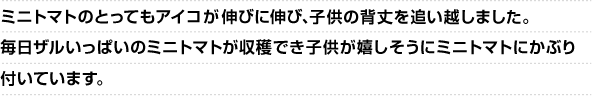 ミニトマトのとってもアイコが伸びに伸び、子供の背丈を追い越しました。毎日ザルいっぱいのミニトマトが収穫でき子供が嬉しそうにミニトマトにかぶり付いています。