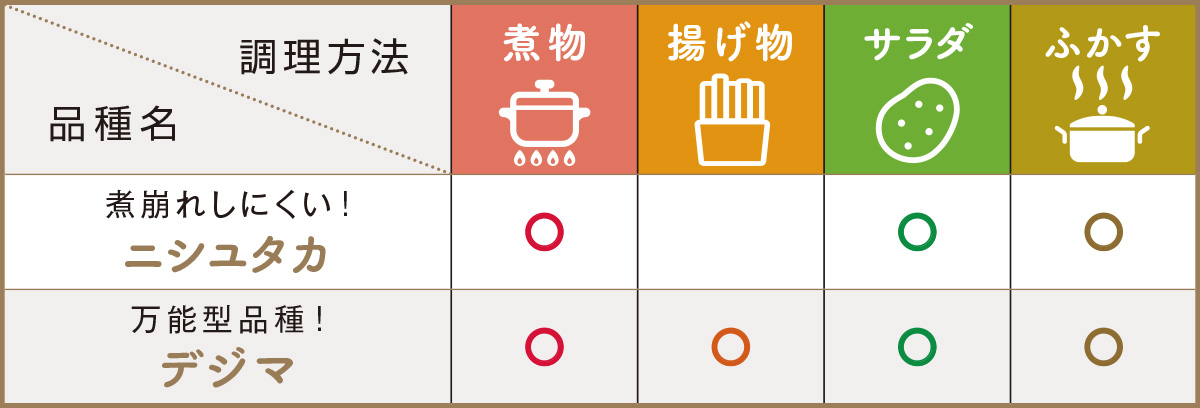 一般的に「ホクホク」して煮くずれしやすいものと「しっとり」として煮くずれしにくいものに大別されます。煮物、サラダ、油料理などの用途に応じて品種を選んではいかがでしょうか?