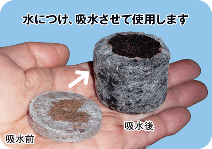 トルコギキョウの種まき~定植をグッと楽にしてくれる「ジフィーセブン」を活用しましょう。ジフィーセブンには育苗に必要な初期肥料が配合されているので、種まき専用の用土など準備いらずで水で膨らませるだけで種まきスタート!