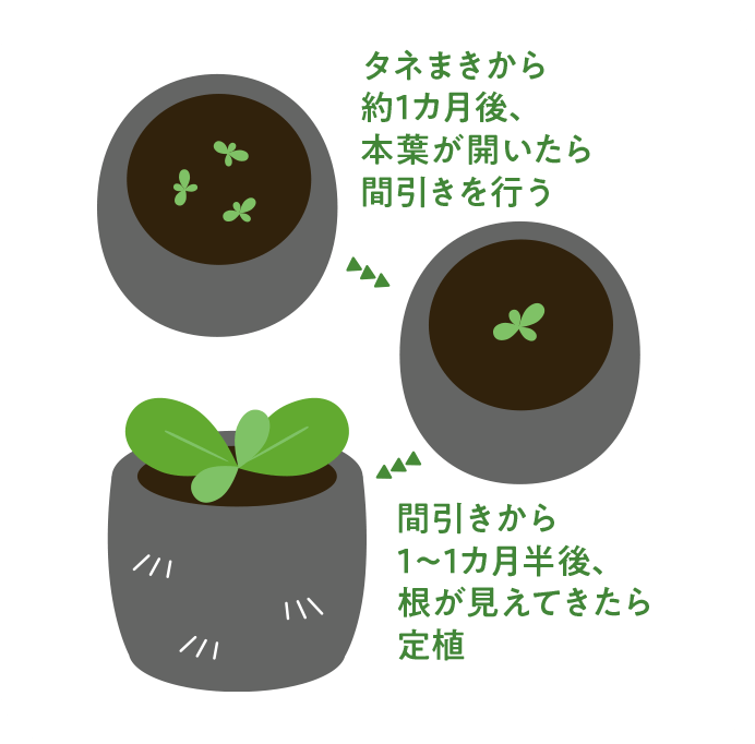 双葉が開き、本葉が見え始めるまで発芽からさらに約2週間かかります。本葉が伸び始めたら、週に1度液肥を与えます。苗が小さく初期生育が遅いので、乾かさないよう注意しましょう。