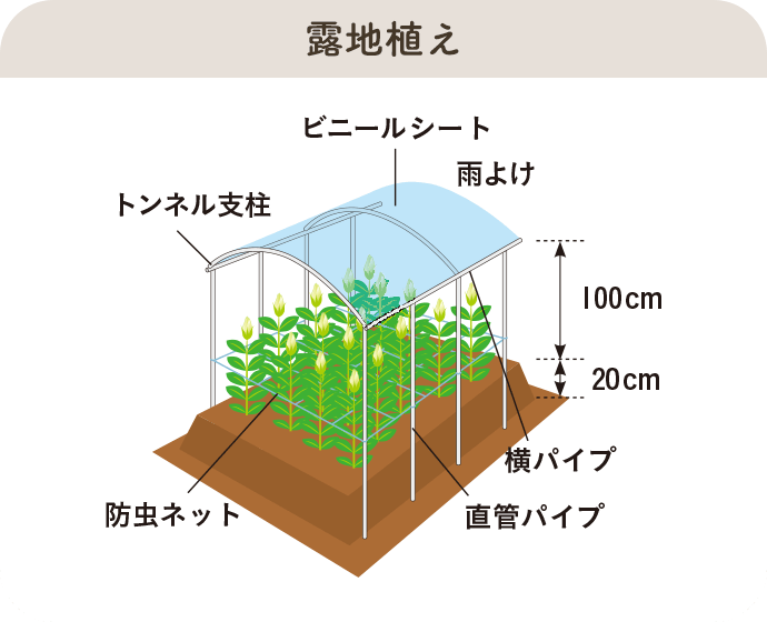 露地植えでは、水はけのよい場所、有機質に富む弱酸性の土壌を好みます。堆肥または腐葉土、元肥を入れ、よく耕します。酸性土の場合は種まきの2週間以上前に苦土石灰で酸度調整します。水はけがよくなるように植え床を中高にするのがコツです。約15cm間隔で、深植え・浅植えにならないように植え付け、支柱とビニールシートなどを使用して雨よけをします。病気、害虫ともに少ない草花ですが、立枯病が出ることがあるので、連作は避けましょう。