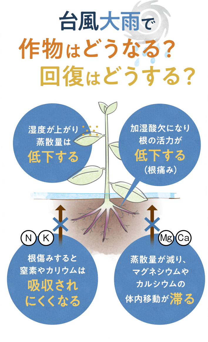 台風による塩分を含んだ雨水や大雨による畑の冠水は、植物に深刻なダメージを与えます。
