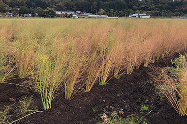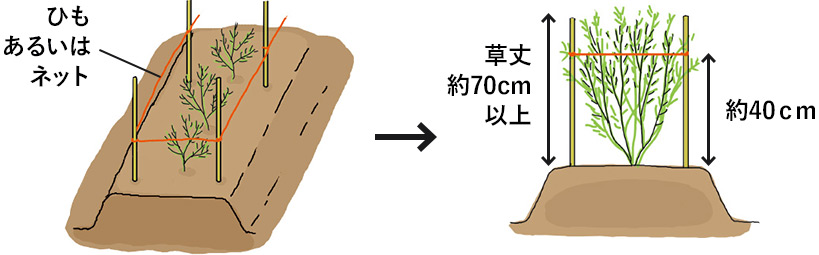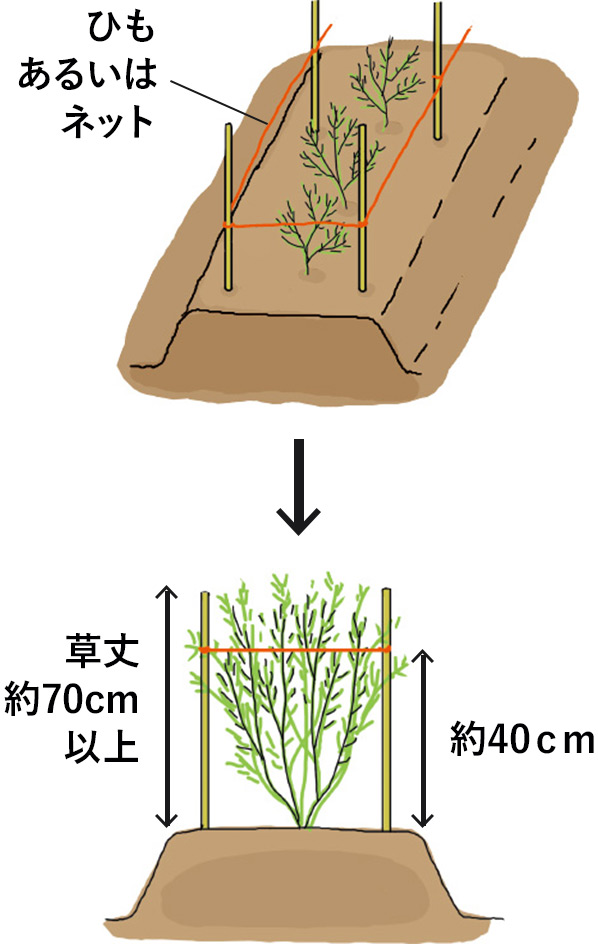 芽が出てきたら風などで倒れないように、ひもやネットで囲いを作り、茎葉が伸びるに従い高さ40cmまでひもを上げていきます。株を育てるため、晩秋で1株当たり茎数は40本、草丈70cm以上を目標とします。雑草防除と適切な水やりを心掛けましょう。