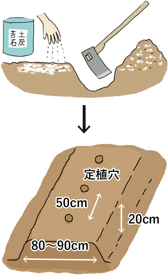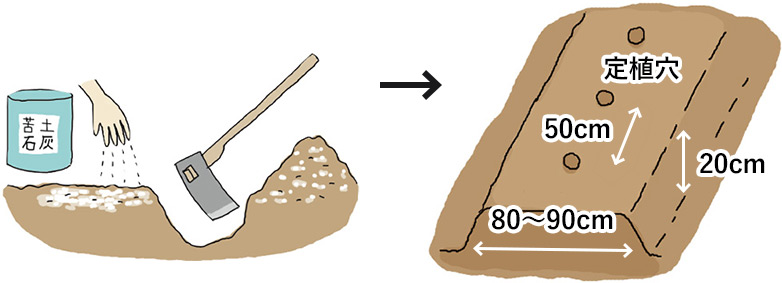 1週間前に1平方メートル当たり堆肥を約3㎏、化成肥料を3握り(約150g)まいてよく耕し、高さ20cmの畝を作ります。