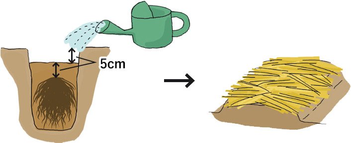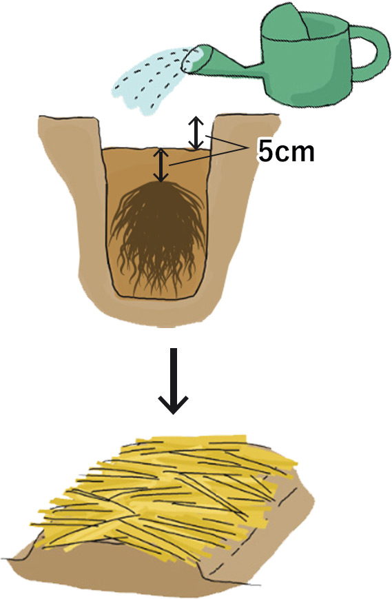 わらなどを5cmほどの厚さに敷き詰めて、霜よけと乾燥防止をしておくとよいです。
