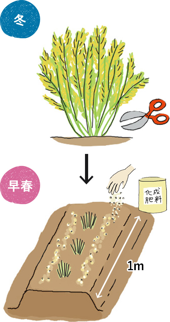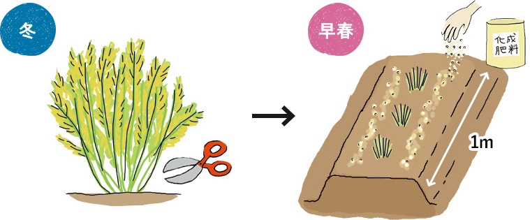 冬に入り、茎葉が黄化したら刈り取って焼却します。早春、茎が出てきたら畝全面に施肥(春肥)として1平方メートル当たり化成肥料を3握り(約150g)を与えます。