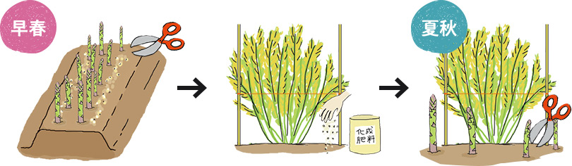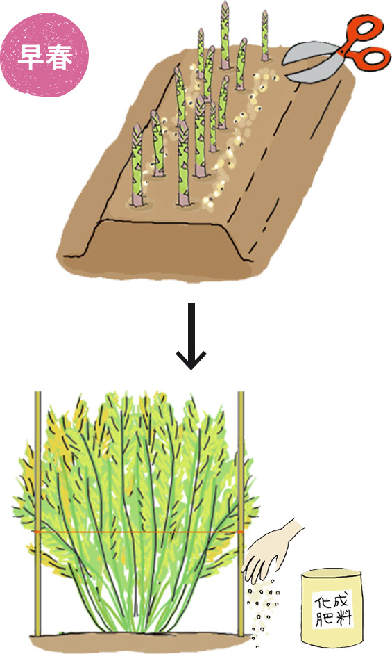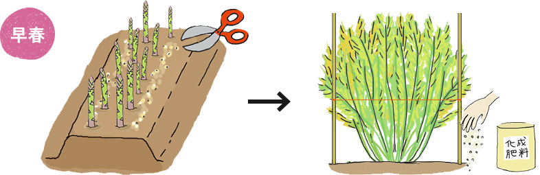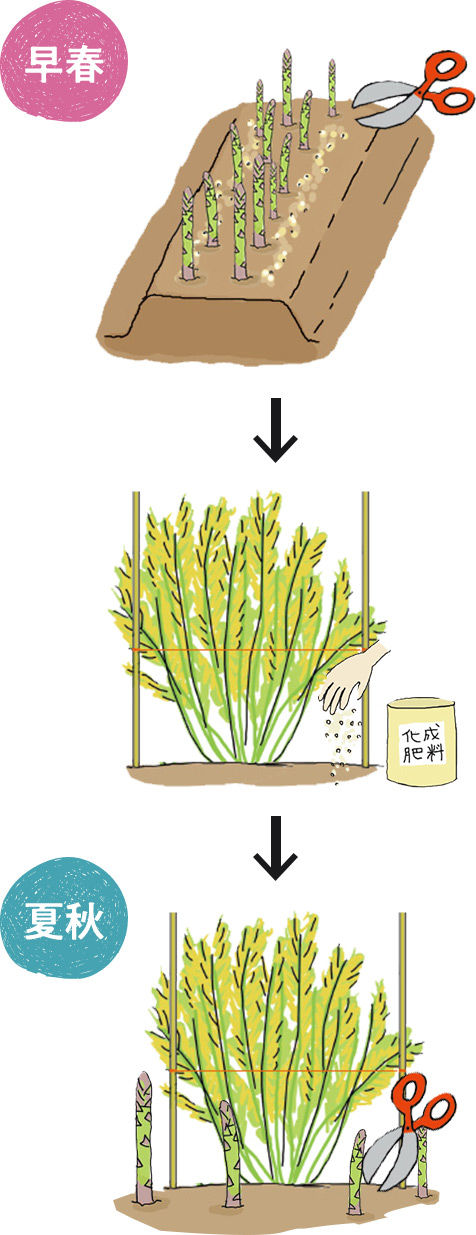 春と夏秋にかけて収穫するメリットは、春のみ収穫するよりも年間の収穫量が倍以上多くなることです。ただし、春のみ収穫のように放任栽培とはいかず、茎葉が茂り過ぎないように本数を抑える立茎が必要です。