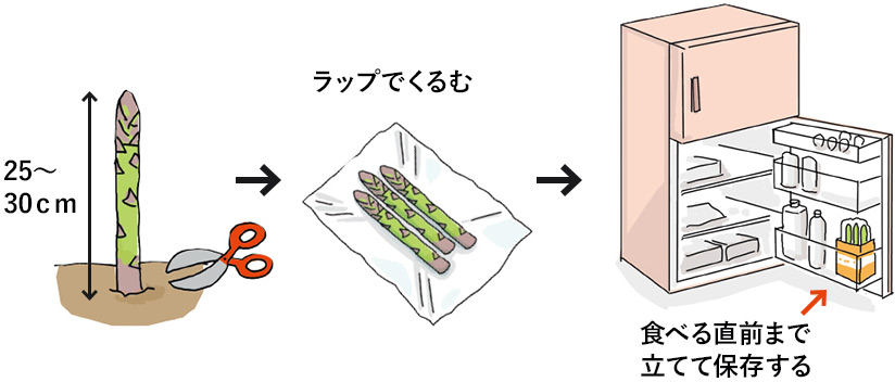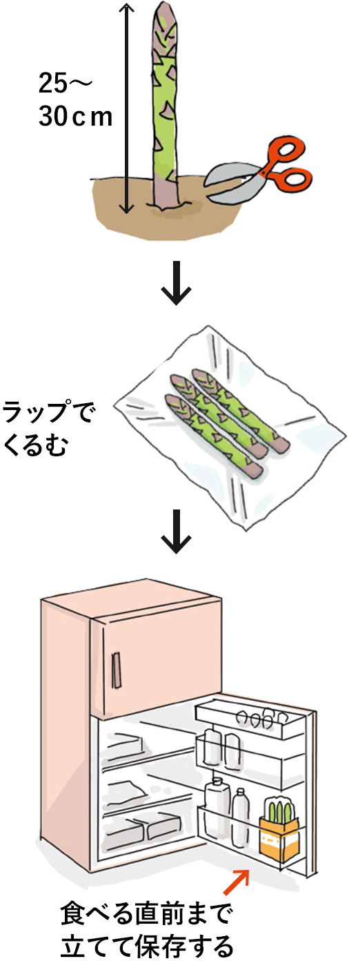 25~30㎝のものをハサミを使って収穫します。収穫したらラップに包んで、食べる直前まで立てて冷蔵庫で保存します。