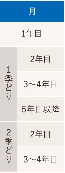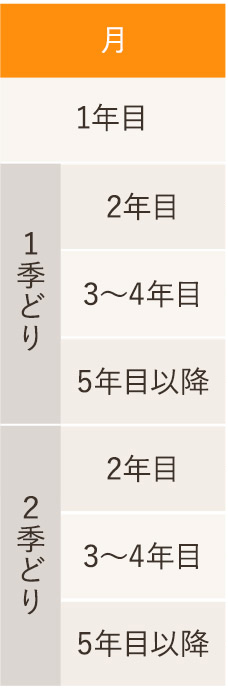 収穫期間は栽培2年目で15~20日間、3~4年目で30~40日間、5~6年目で50~60日間くらいに抑えます。