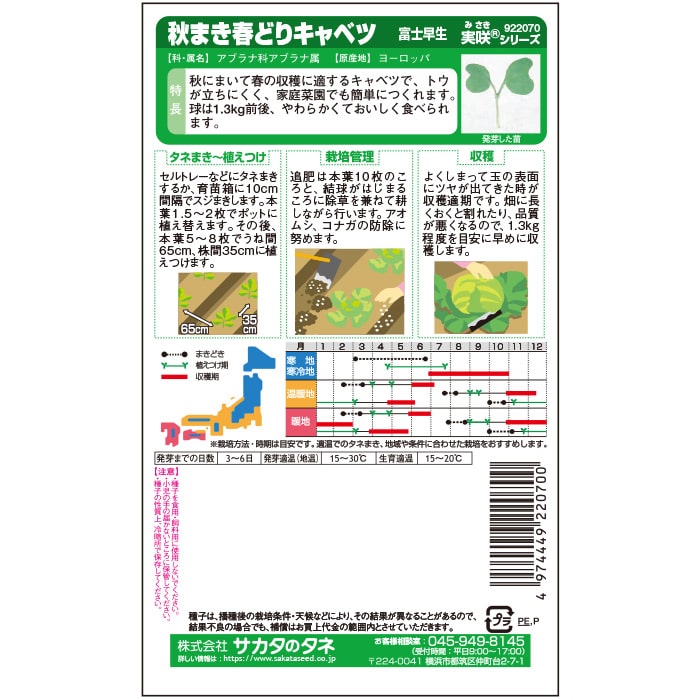 まき時期も広く作りやすいお手軽キャベツ。秋にまいて春の収穫に適するキャベツで、とうが立ちにくく、家庭菜園でも簡単に作れます。柔らかくておいしく食べられます。