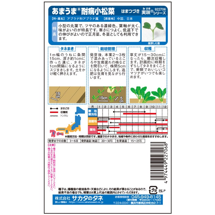とう立ちが遅く、低温伸長性に優れ、厳寒期でも栽培可能。葉軸の色は濃緑でテリが強く葉柄部は太く株張りがしっかりしています。萎黄病に対し耐病性を持ちます。