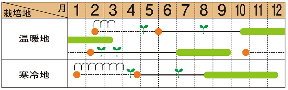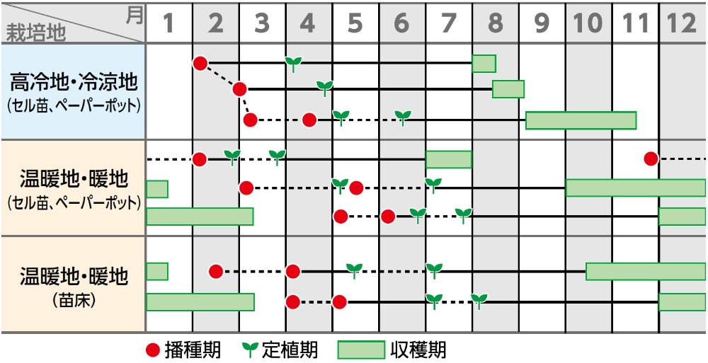 扇シリーズで最も生育旺盛で太りのよい黒柄系一本ネギです。暑さ寒さに強く、温暖地では秋冬どり、夏どりができます。厳寒期でも葉が枯れにくく、太りのよい特長があります。一方で、収穫が遅れると襟部が緩むため、襟部のしまりがよいときに収穫します。