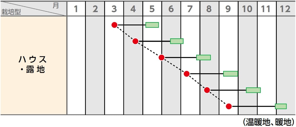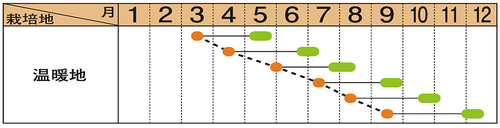 タネまきから60~70日で収穫できる中早生種です。まき時期が3月中旬~9月中旬の暑い時期におすすめの品種。