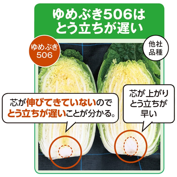 外葉は鮮やかな緑色で中身は全体に黄色く、カットしたときの見栄えがよいのが特長で、肉質は柔らかく、おいしい品種です。