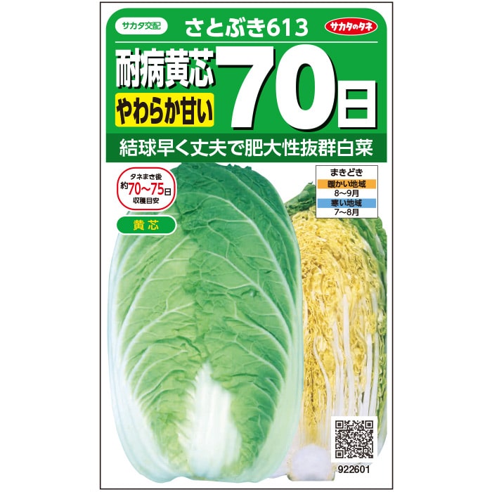 柔らかく、みずみずしいので生でも食べられます。火を通すとさらに甘みがアップする、とてもおいしいハクサイです。芯部の黄色がきれいで調理後も見栄えがします。病気や生理障害に強いので、丈夫で栽培も楽です。