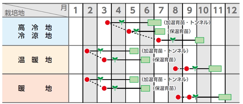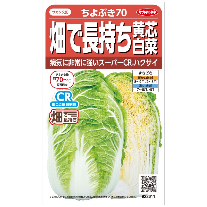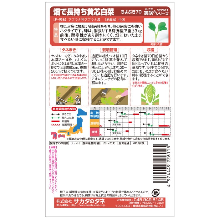 外葉はコンパクトで立性。葉色は濃緑で肉厚、強健で頭部は深く抱合します。球内色は全体に黄色がまわり、甘みがのりやすく、食味、品質がよいです。