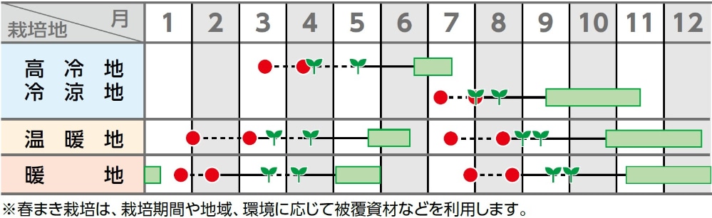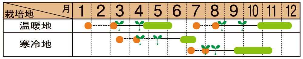 タネまき時期が長く栽培適応性が広いので、全国的に栽培されています。品質のよい花蕾が安定して収穫できます。