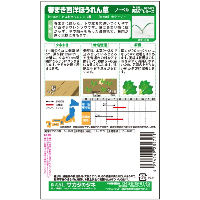 春まきに適した、とう立ちの遅い作りやすい西洋ホウレンソウです。葉はあまり横に広がらず、やや縮みをもった濃緑色で、葉肉が厚く大株に育ちます。