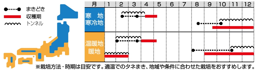 葉は浅く欠刻の入る広葉で、葉色は極濃緑色です。生育は「リード」並みで、株張りのよい多収型品種です。草姿は極立性で、収穫調整作業が容易です。抽だいが比較的安定しているので露地では8~10月上旬まきと2~3月まき、ハウス栽培では8~10月下旬まきと1~3月まきに適しています。