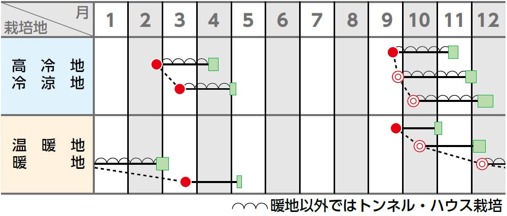 べと病R-1~19に抵抗性をもちます。低温伸長性があり、秋~春先まで種まき可能です。葉枚数が多く、立性で収量、収穫作業性に優れる特長があります。