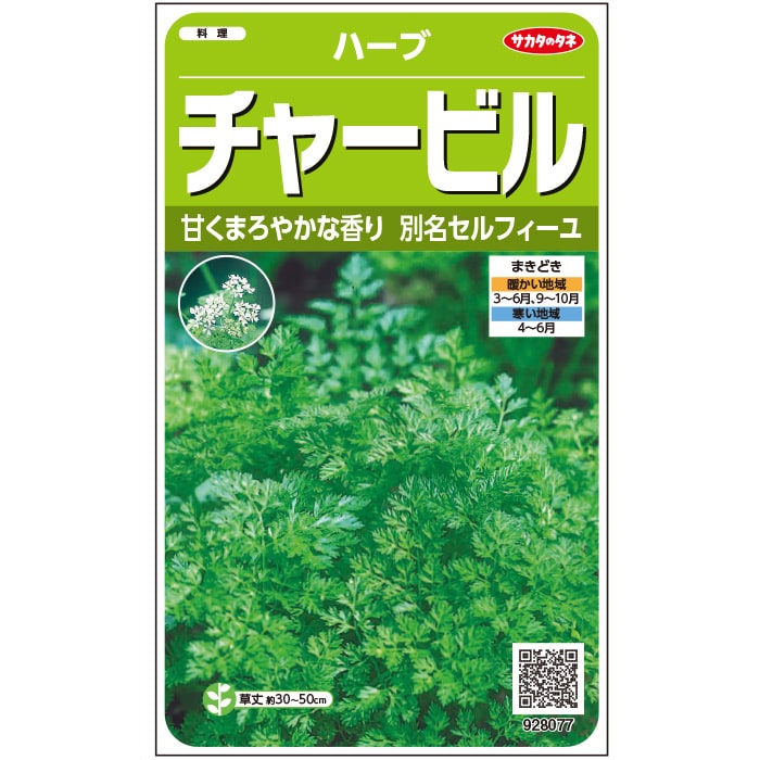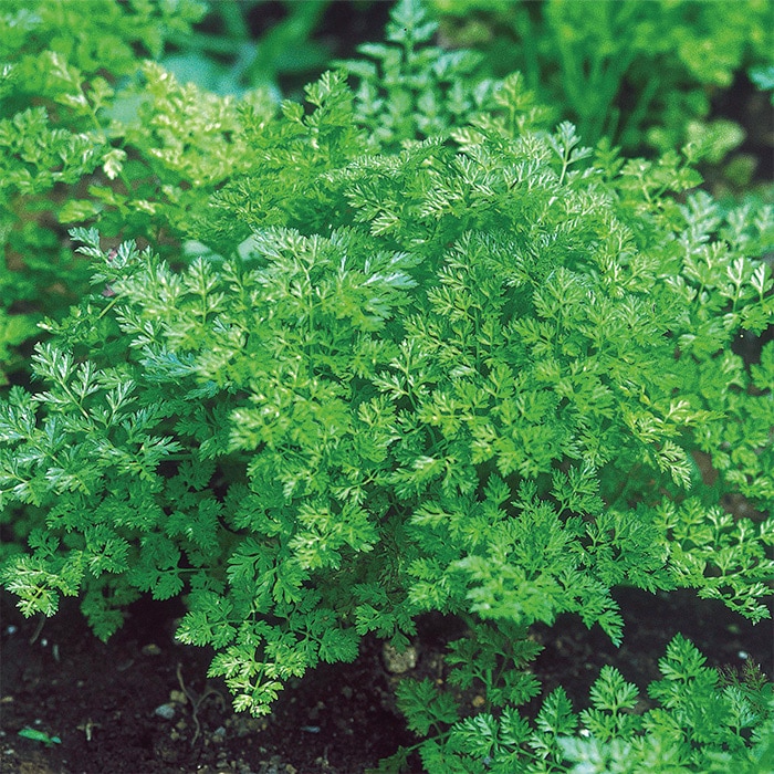 グルメのパセリまたは、セルフィーユとも呼ばれ、フランス料理でよく使われるハーブです。甘くまろやかな香りのする葉を刻んで、白身の魚料理や卵料理のほか、サラダの風味づけやスープの浮き実などに利用します。