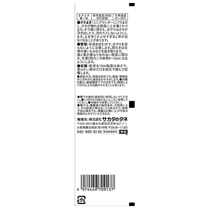 新芽を10cm程度の長さで、柔らかい部分だけを指先で摘んで収穫します。タネまきから収穫まで短く、1度のタネまきで1包分のタネを使い切りできるミニサイズの絵袋入り種子シリーズです。自分で育てたとれたて野菜の味は格別!そして安心!気軽に始めてみませんか?いつか本格家庭菜園にチャレンジしたい方の第一歩にもおすすめです。