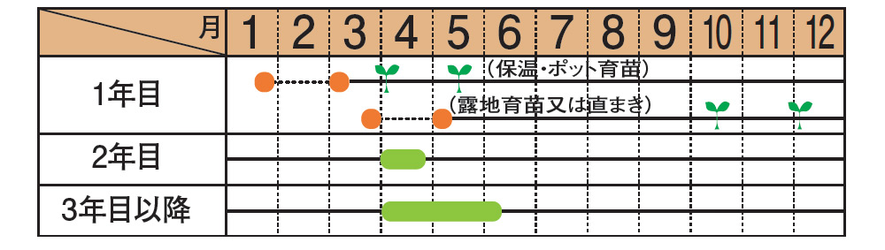 栽培のコツアスパラガスは、まず株を育てるのが大切。1年目は収穫せず、2年目も控えめに収穫。こうして我慢することで3年目以降はたくさん収穫できます。