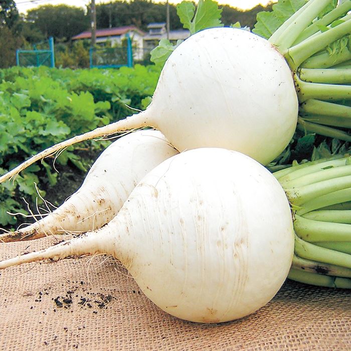 京野菜の代表種、丸形ダイコン。青首の丸球で、す入りは遅いです。肉質はきめ細かく、甘みがあります。