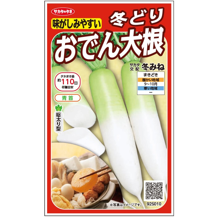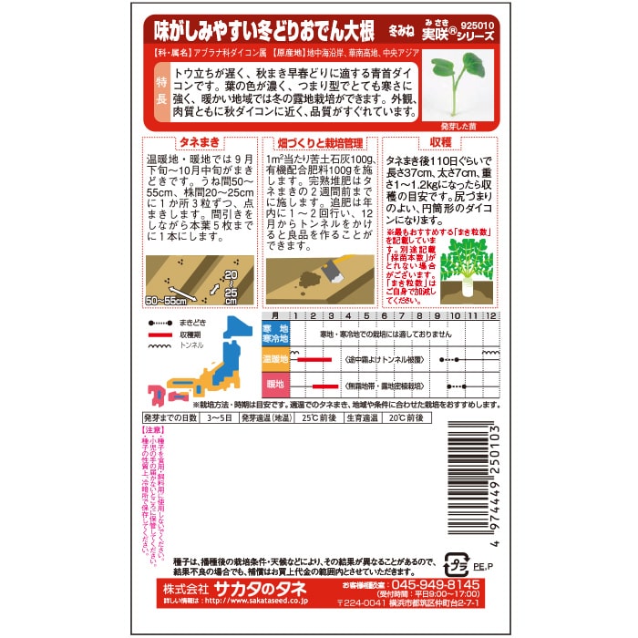 晩抽系の青首ダイコンであり、品質、外観とも秋系大根に近く、す入りも遅いです。3月下旬くらいまでは抽だいの心配なく収穫できます。やや黒葉のつまり葉、特に耐寒性が強く、暖地無霜地帯での密植型露地越冬栽培および温暖地の霜よけトンネル栽培に最適です。根部は根長37㎝、根径7㎝で肌にテリがあり、尻部の肉付きがよいです。首部内部の青肉になりにくいです。