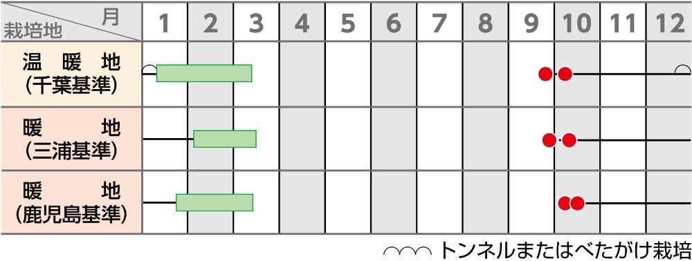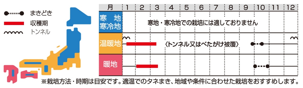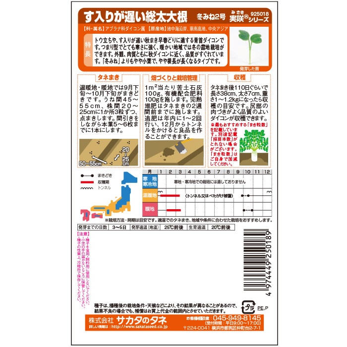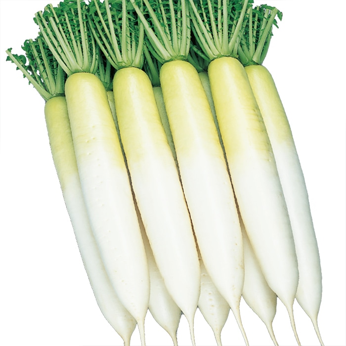 とう立ちや、す入りが遅い秋まき早春どりに適する青首ダイコンです。つまり型でとても寒さに強く、暖かい地域では冬の露地栽培ができます。外観、肉質ともに秋ダイコンに近く、品質が優れています。「冬みね」よりもやや小葉で、やや根長が長くなるタイプです。