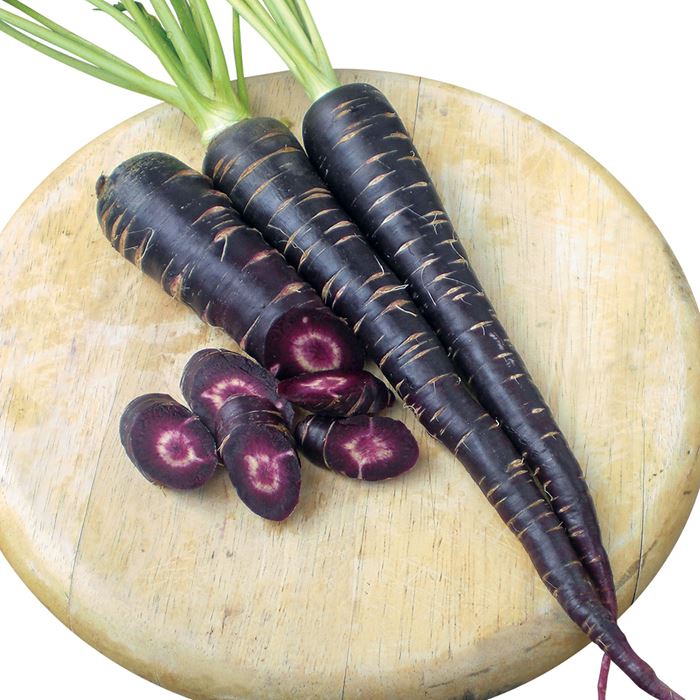 珍しい黒紫のニンジンです。根内部も黒紫でわずかに芯部が白色になります。極早生種で生育旺盛。ニンジンの中では極めて糖度が高く10~13度になります。アントシアンを豊富に含み、ジュースや色素抽出加工に適しています。