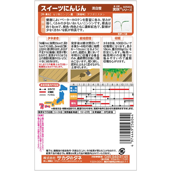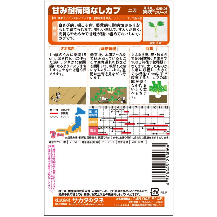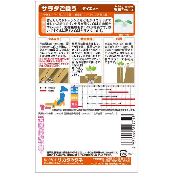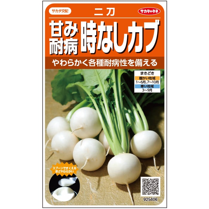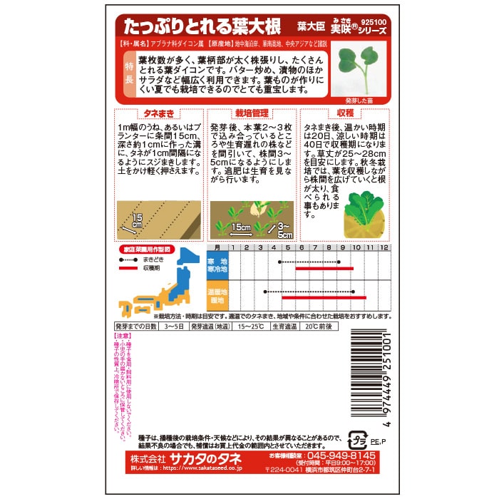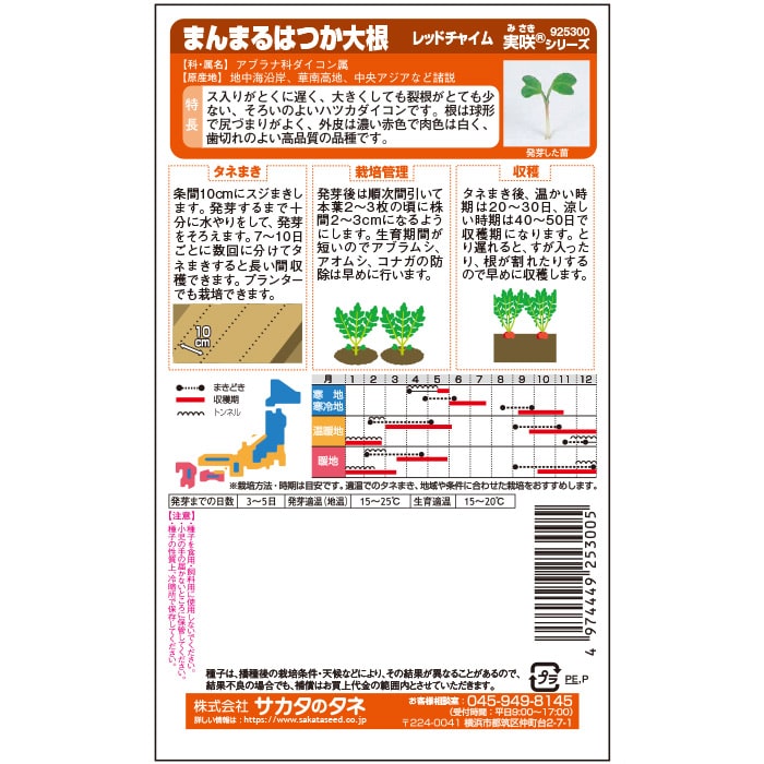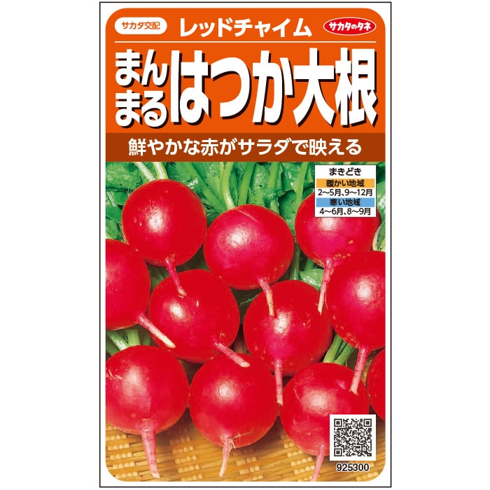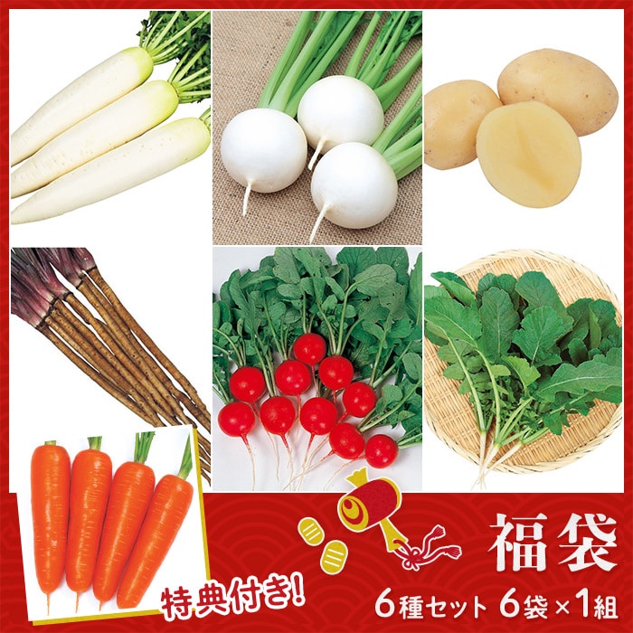 - ジャガイモ プチじゃが(約5粒)、小カブ 二刀 (約800粒)、ダイコン 強力春大根 (約130粒)、葉ダイコン 葉大臣 (約900粒)、ハツカダイコン レッドチャイム (約350粒)、サラダゴボウ ダイエット (約250粒)各1袋