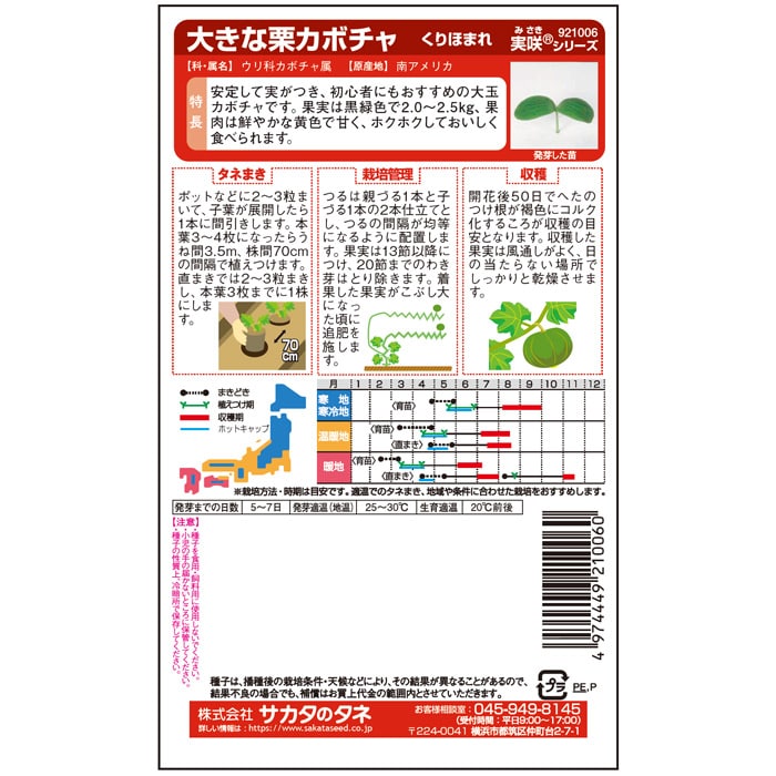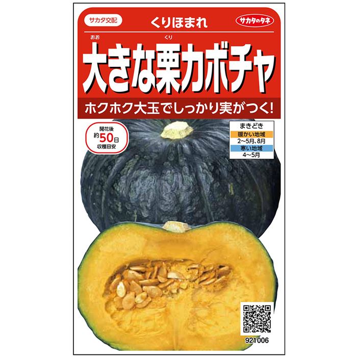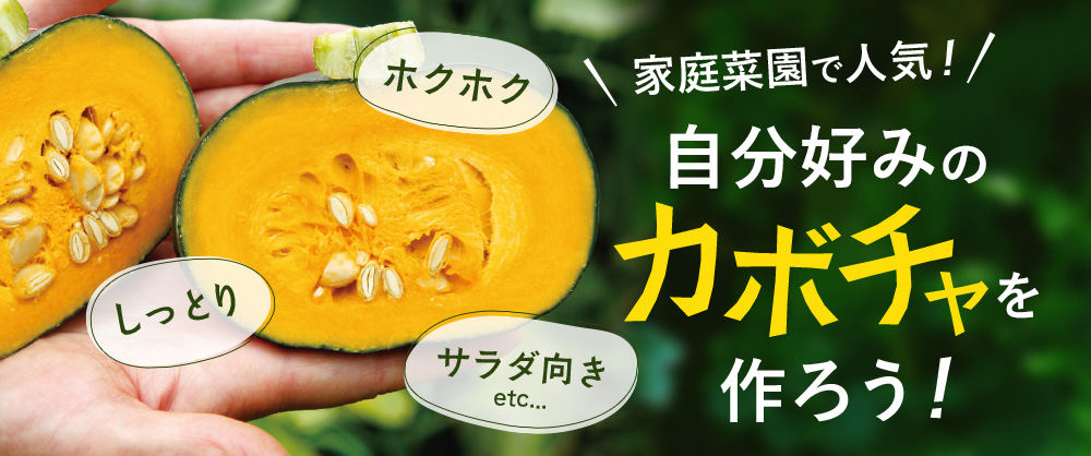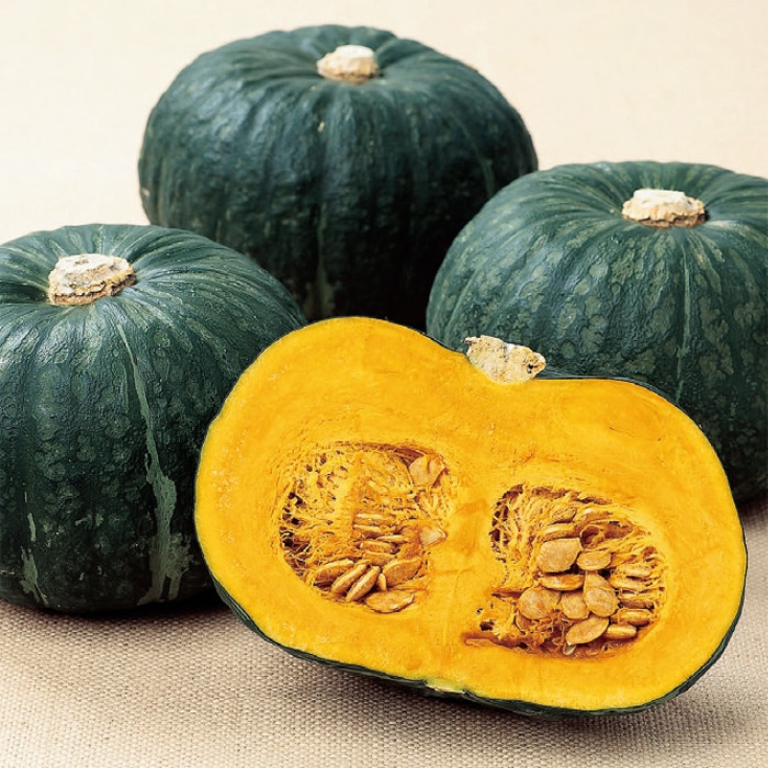 安定して実が付き、初心者にもおすすめの大玉カボチャです。果皮は黒緑色、果肉は鮮やかな黄色で甘く、ホクホクしておいしく食べられます。