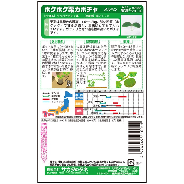 ほっこりとした味わいが持ち味の栗カボチャの代表種。低温でもよく育ち、着果性がよいので家庭菜園にもぴったり。ホクホク感と甘さでは、右に出るものはありません。湿害に強いのも特徴です。