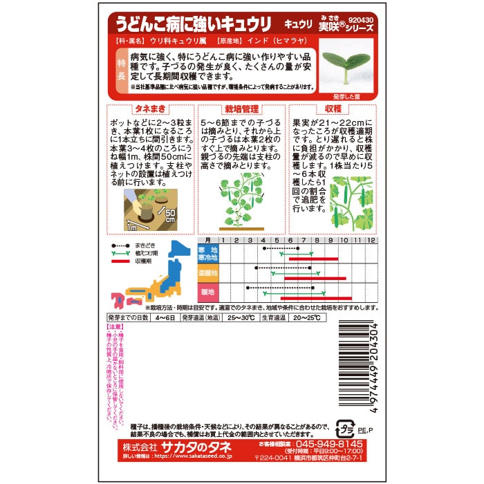 白いぼタイプ。病気に強く、特にうどんこ病に強い作りやすい品種です。安定して長期間収穫を楽しめ、地這い栽培もできます。