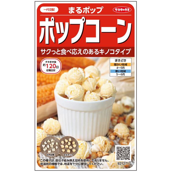 家庭で簡単にポップコーンが作れるトウモロコシ。草丈が高く生育が旺盛な晩生種です。穂は長めの大型で収量は多いです。完全に熟させてよく乾燥したものをいると、丸くはじけて何倍にも膨らみます。穂からとれる粒数は約650粒です。