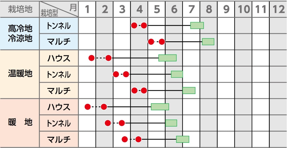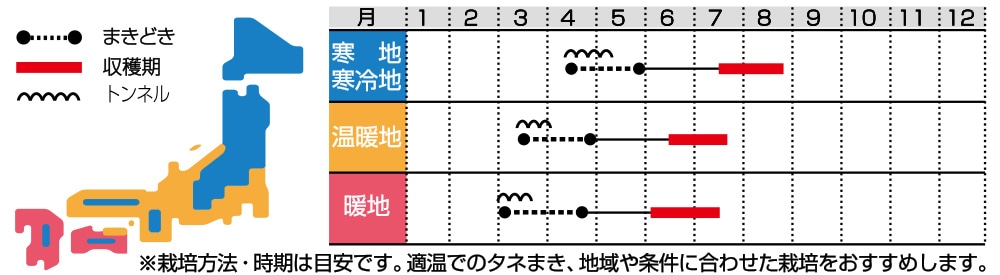 ※収穫目安はサカタのタネ 掛川総合研究センター(静岡県)における「露地マルチ栽培」での日数です。